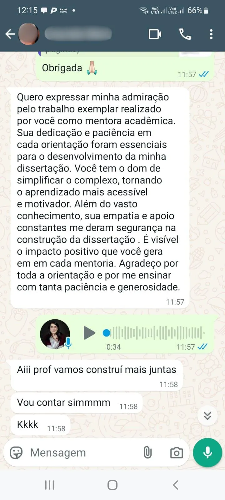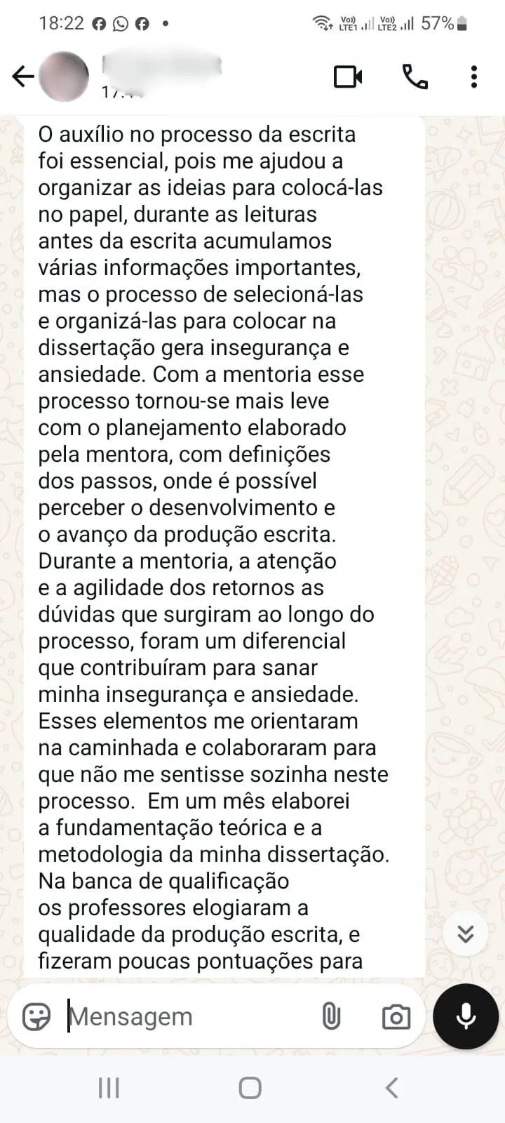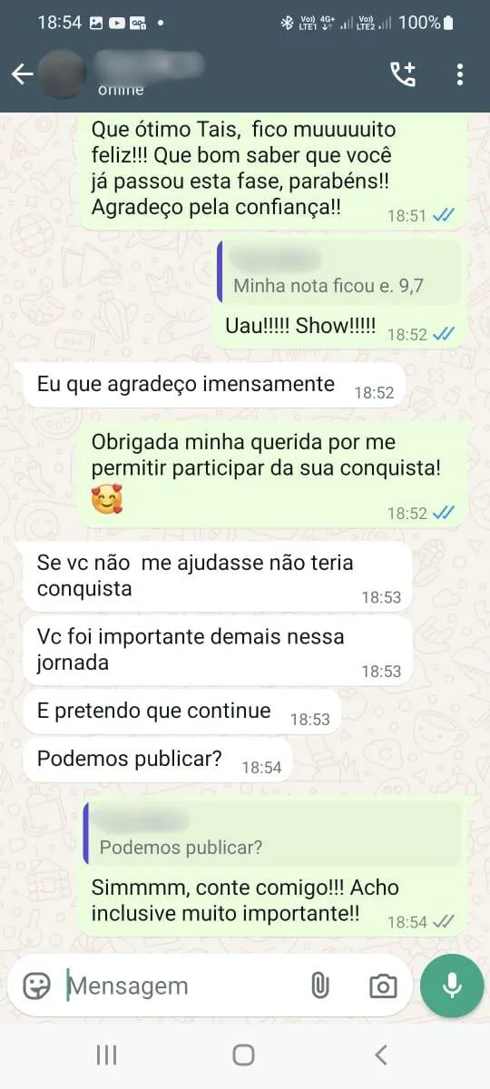 Eu não conseguia escrever uma linha. Hoje, tenho meu diploma e fui elogiado pela banca. Obrigado, Luciana."